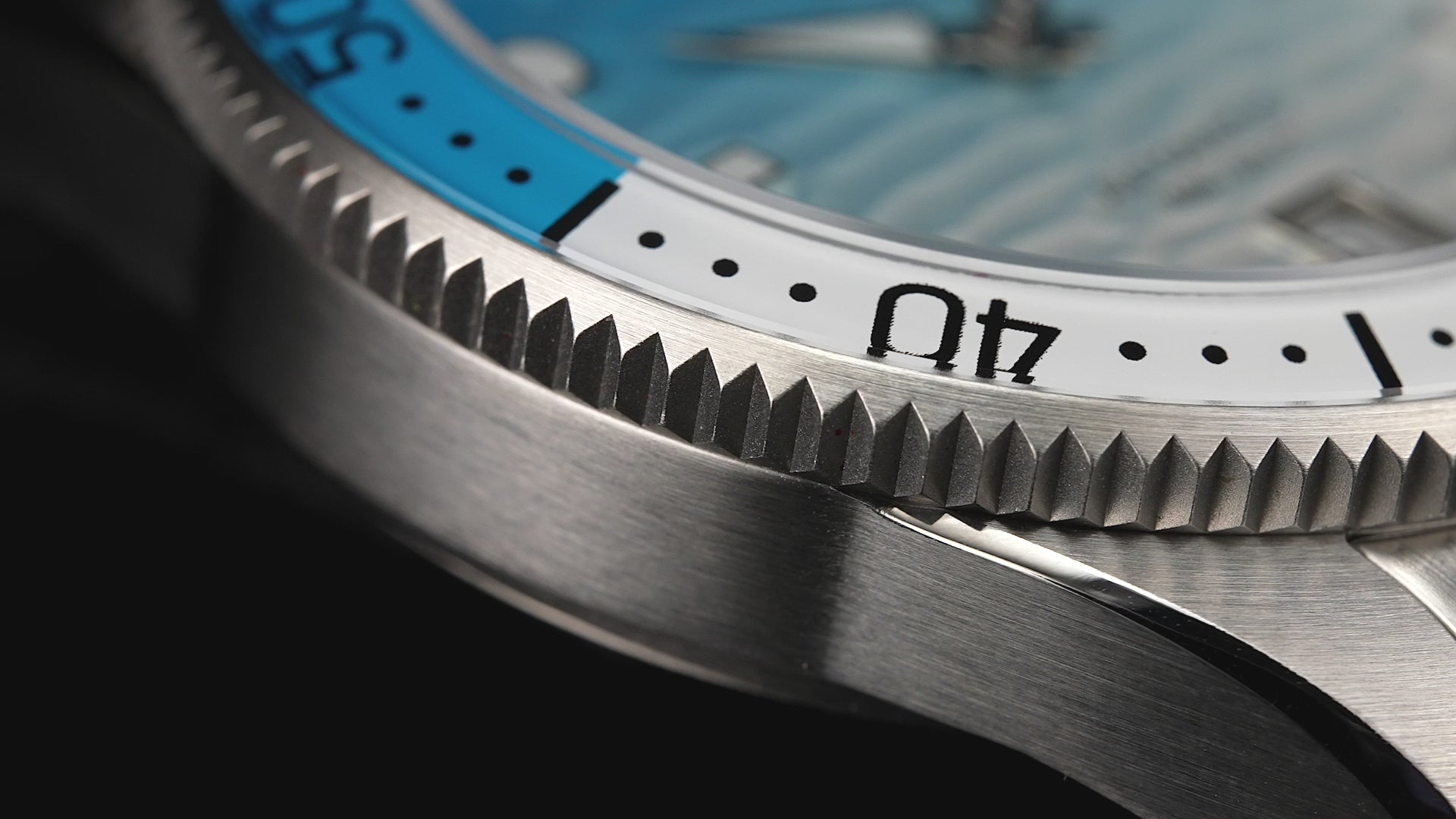 The Tidewave Automatic Diver Watch features a case made of 316L stainless steel, which is 100% recycled. The top glass is made of durable sapphire crystal.