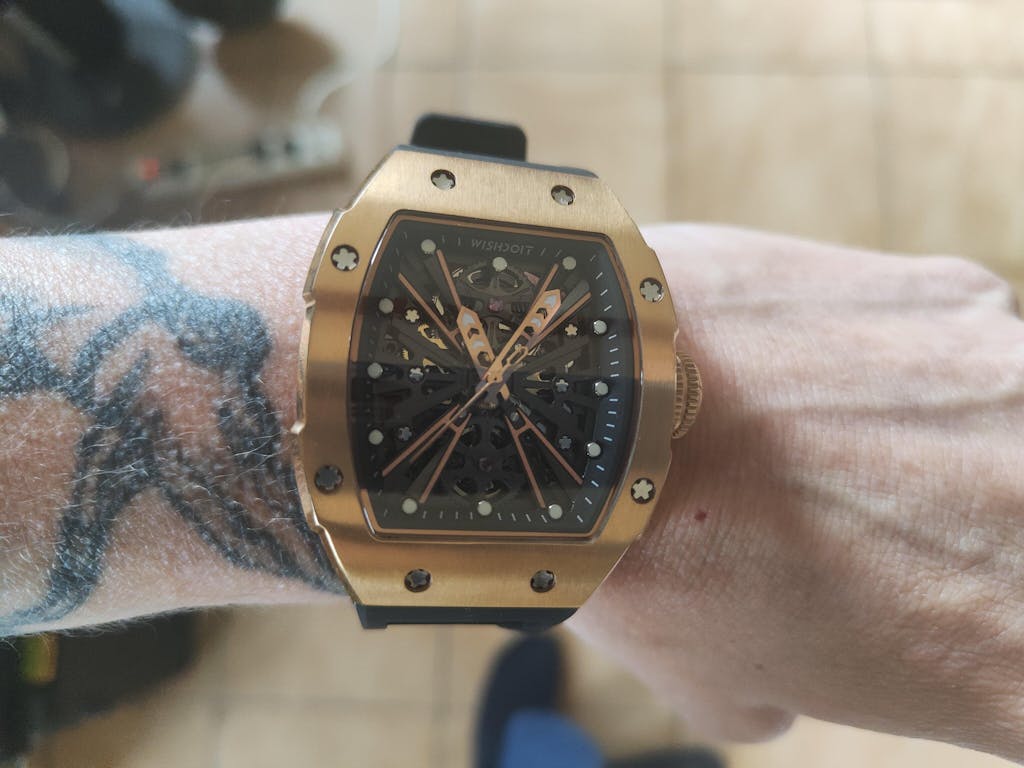 The open-worked skeleton design reveals the mechanical heart of the watch, showcasing the precision and craftsmanship behind every second.