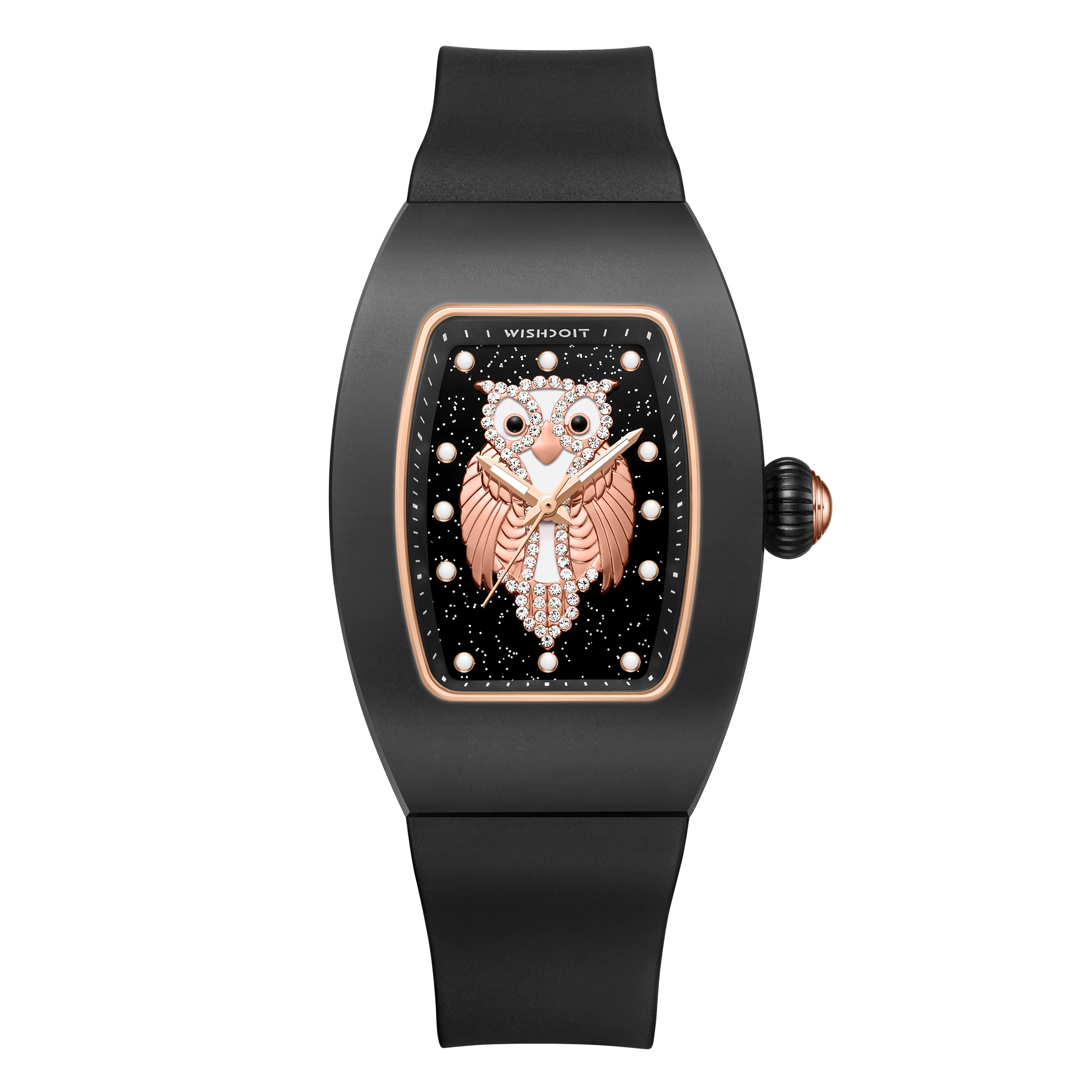 Wishdoit Watches Tonneau Affordable Best Women Chronograph l Owl Women's Ceramic Watches|Starry Dial| Fluorine Rubber Watch StraplBlack(Black Strap)