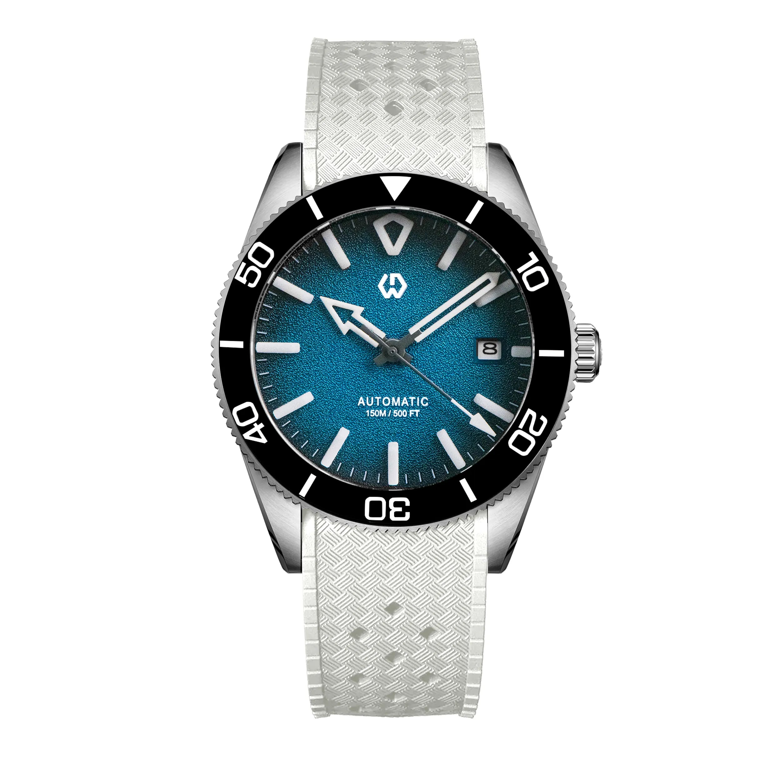The gradient dial, glowing from vibrant highlights to deep shades, mirrors the ever-changing tides of a stormy sea — mysterious, powerful, and alive. Encased in a durable black ceramic bezel, the watch stands bold and resilient, ready for any challenge, above or below the water.