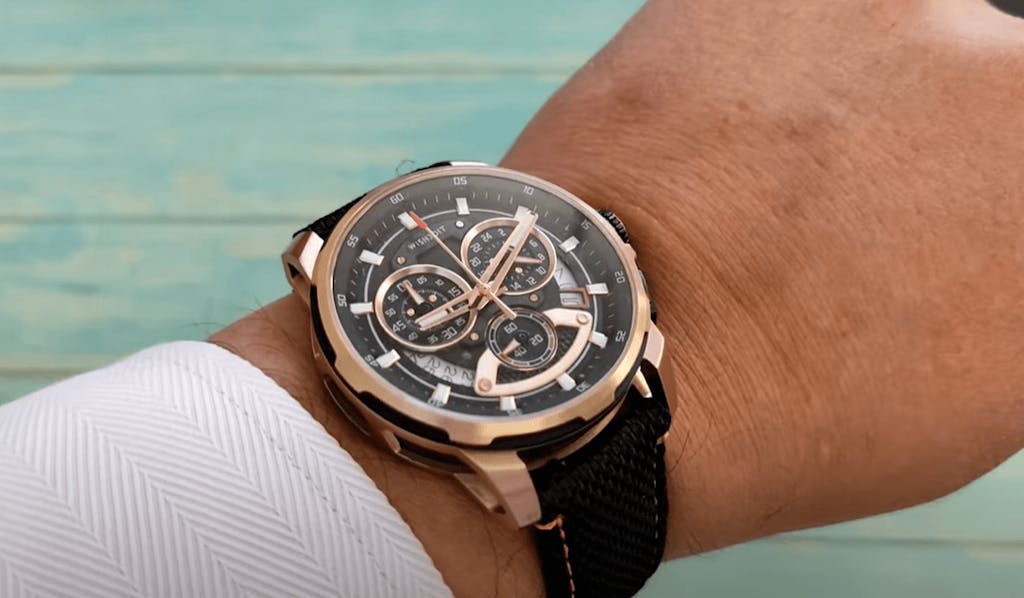 The case is made of 316L stainless steel, which is 100% recycled, and the strap is a combination of nylon and genuine leather with a stainless steel buckle. The dial is made of brass and has undergone extensive processing for a refined finish.