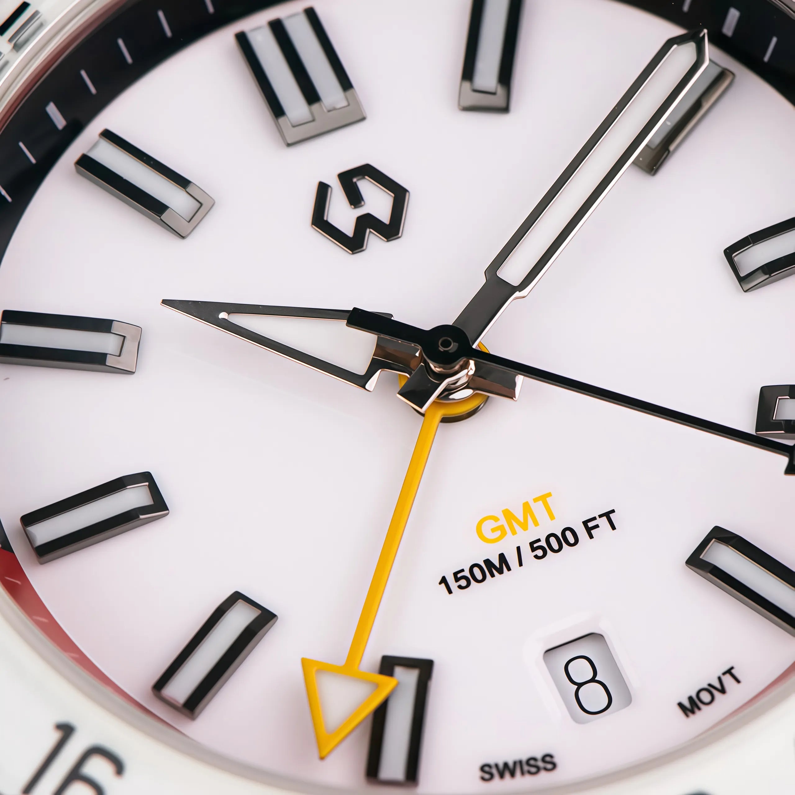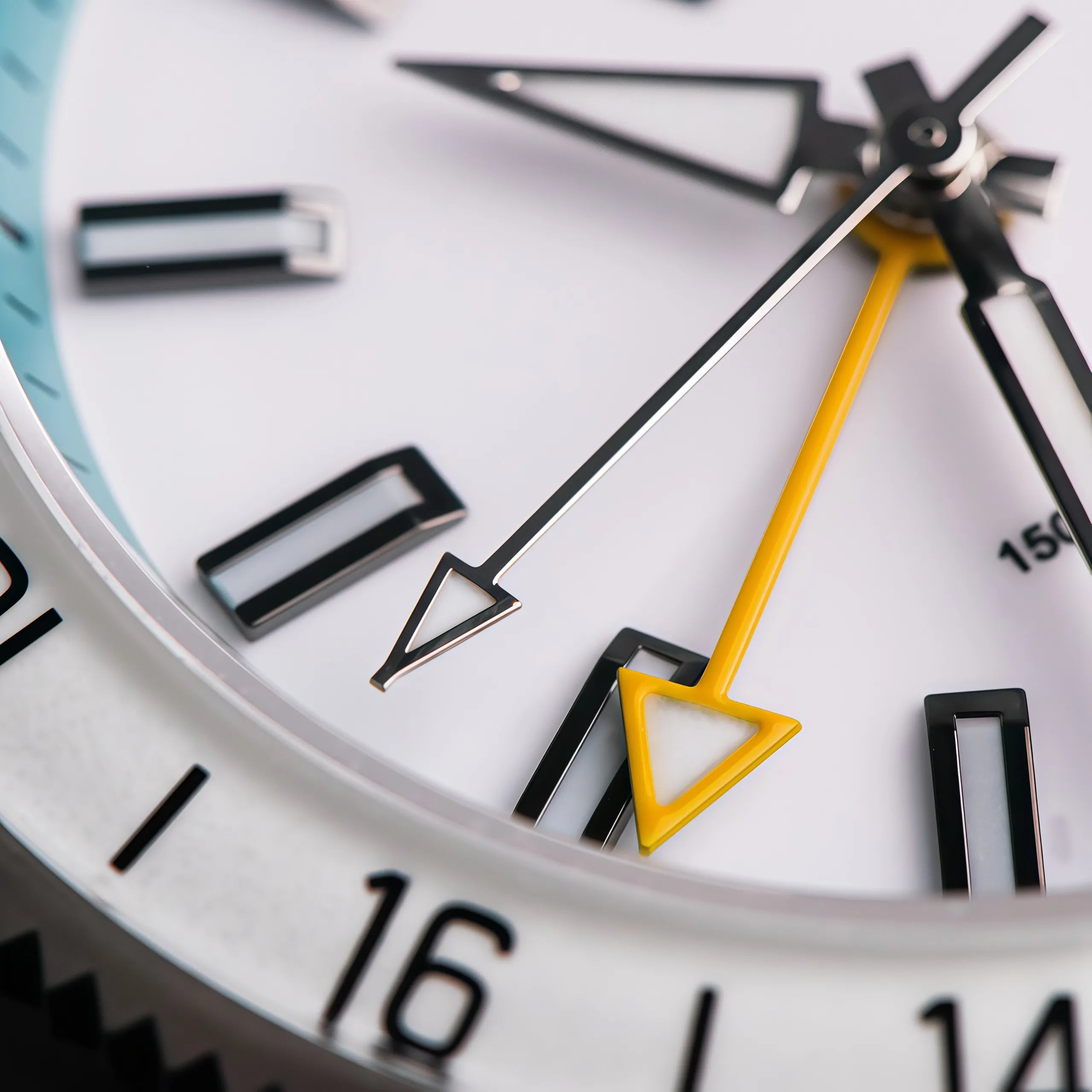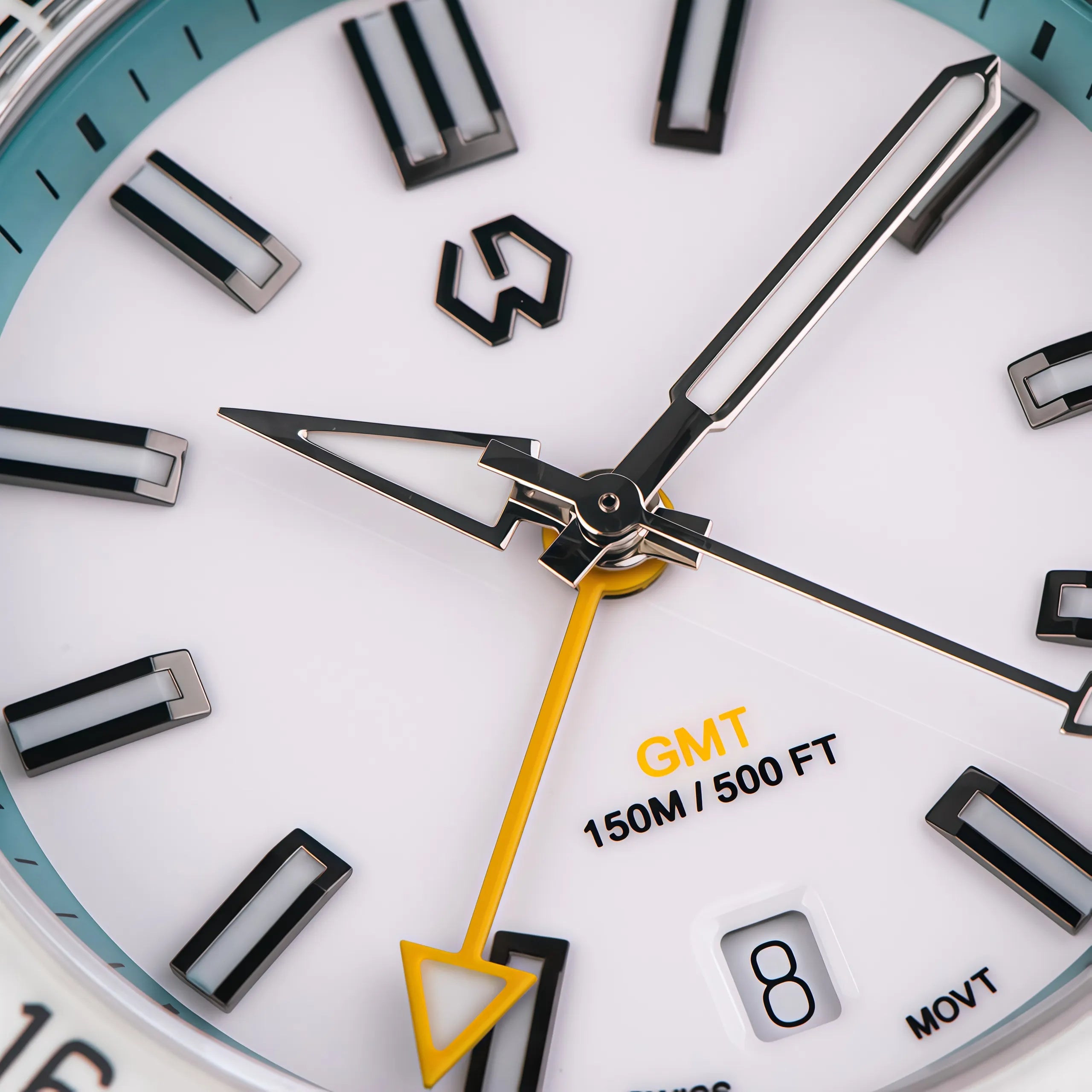 WISHDOIT Ocean Edge Quartz GMT Diver combines clean, minimalist design with a dynamic splash of color, making it the perfect companion for both underwater adventures and urban life. Its white dial is accented by subtle colored borders, creating a modern and sophisticated look that stands out at a glance.
