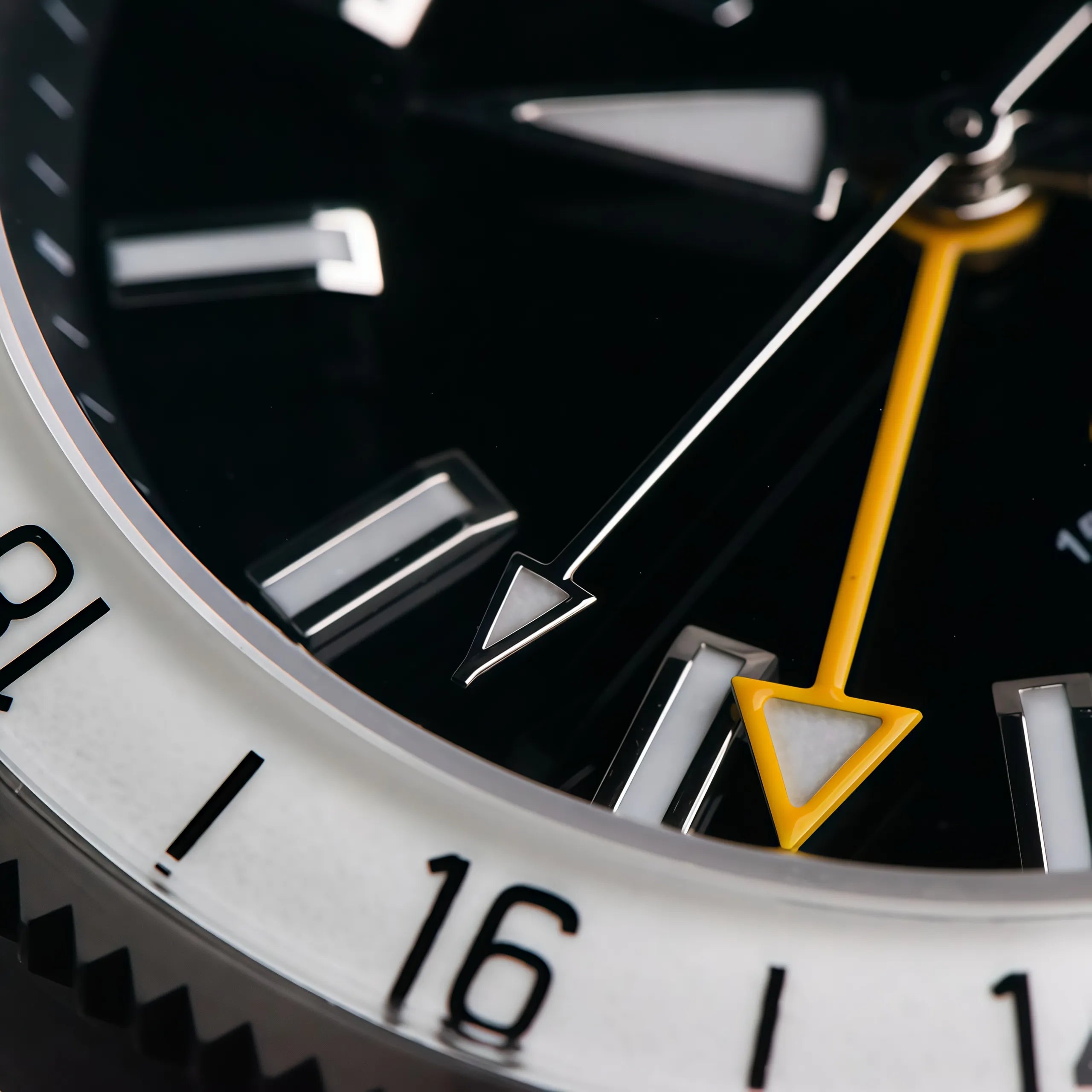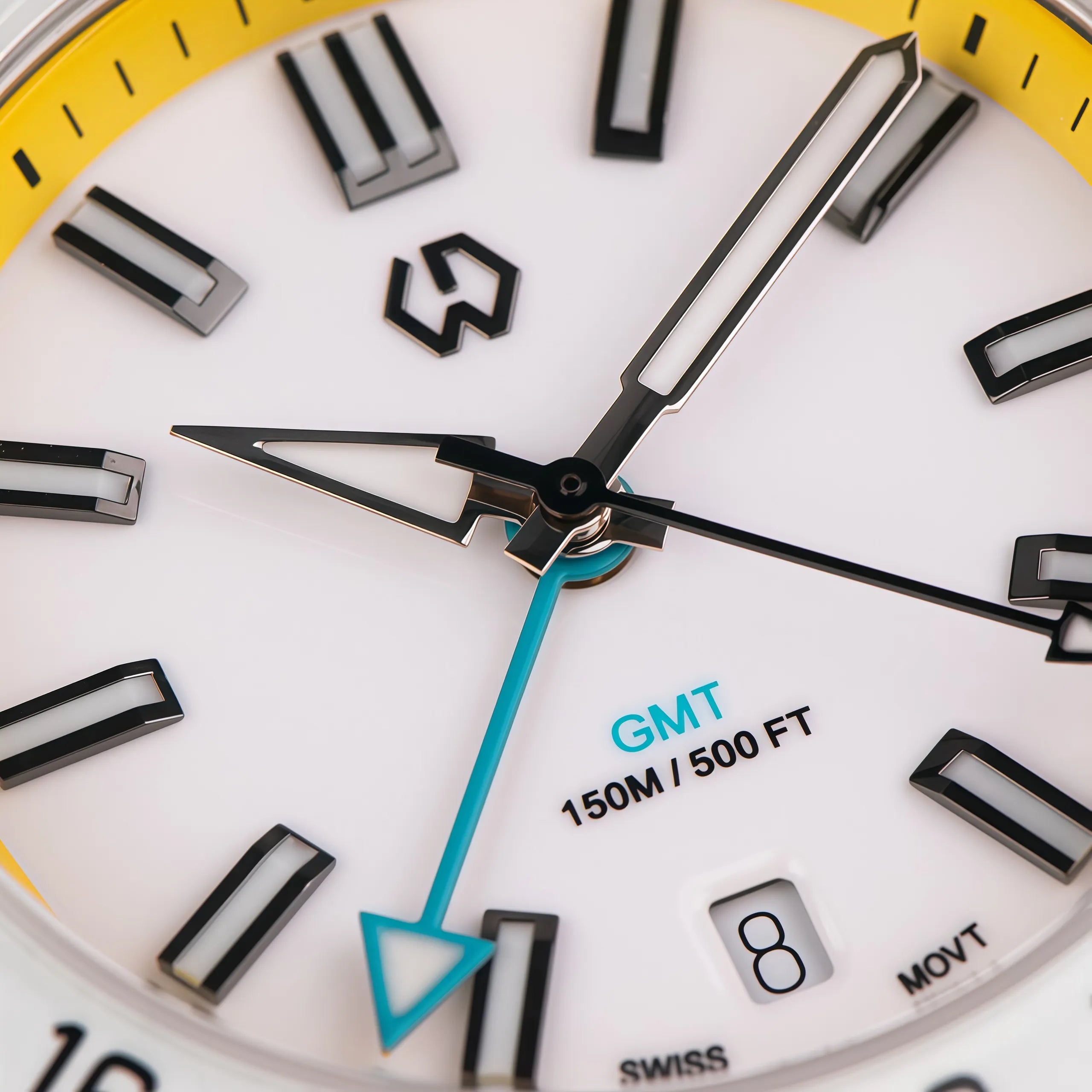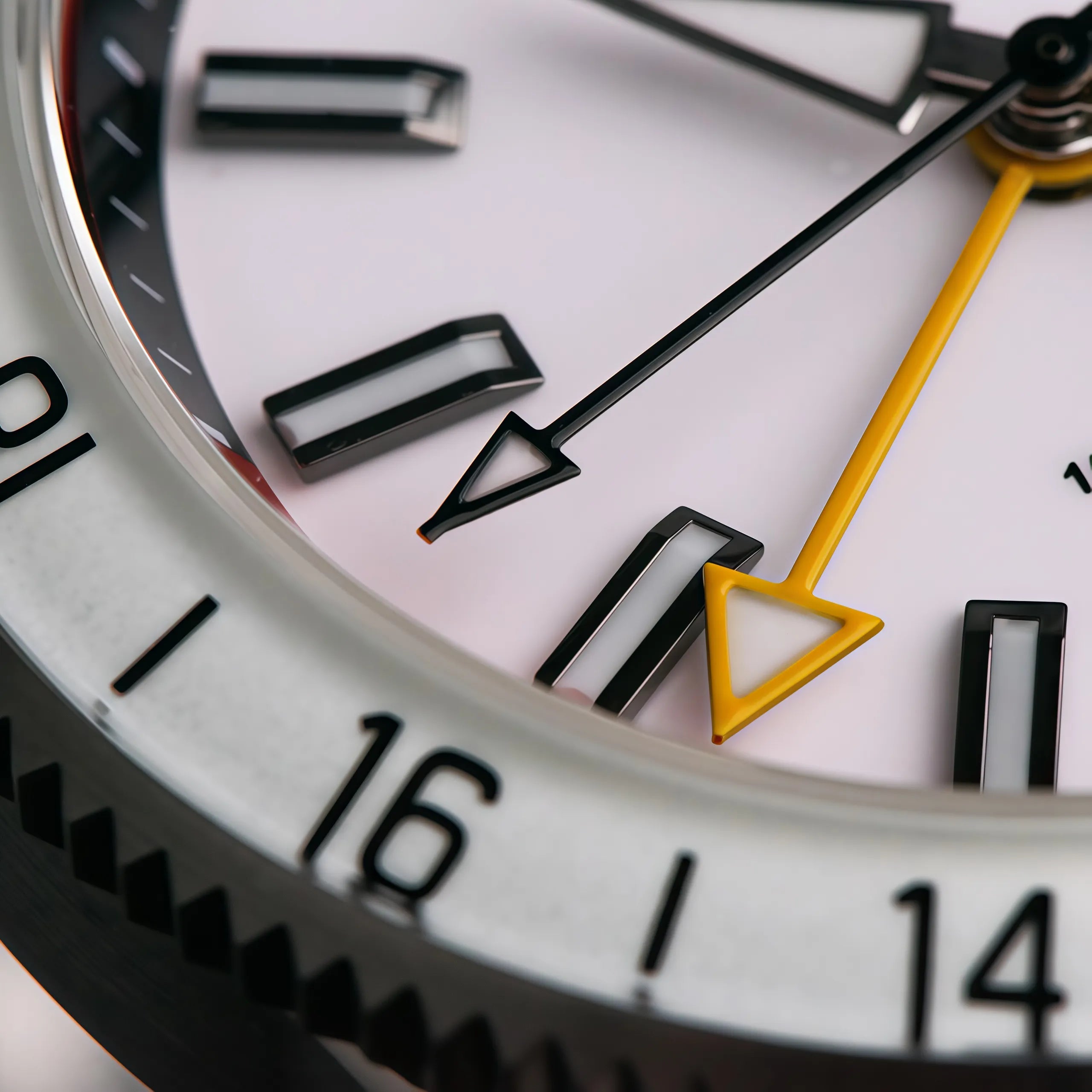 WISHDOIT Ocean Edge Quartz GMT Diver combines clean, minimalist design with a dynamic splash of color, making it the perfect companion for both underwater adventures and urban life. Its white dial is accented by subtle colored borders, creating a modern and sophisticated look that stands out at a glance.